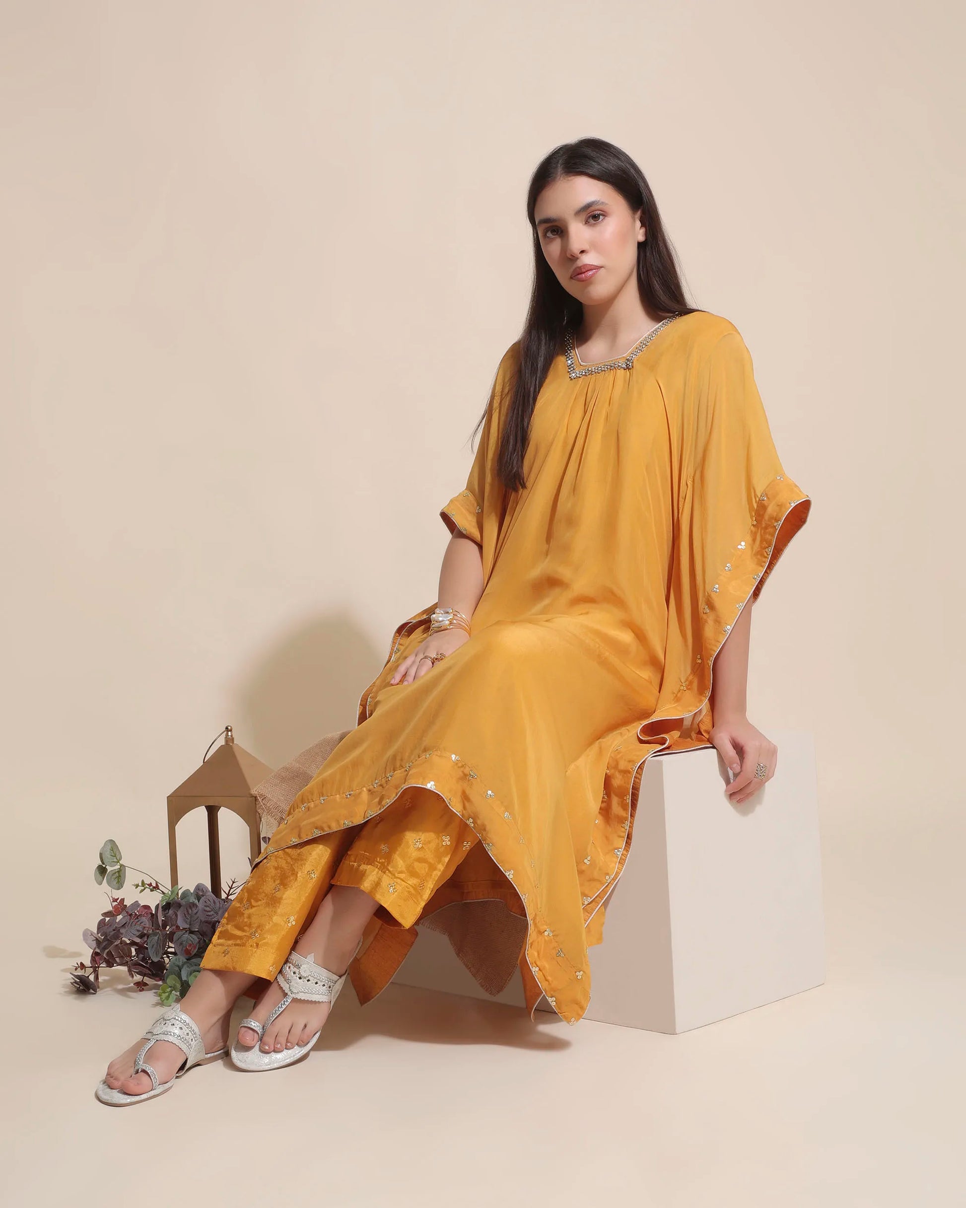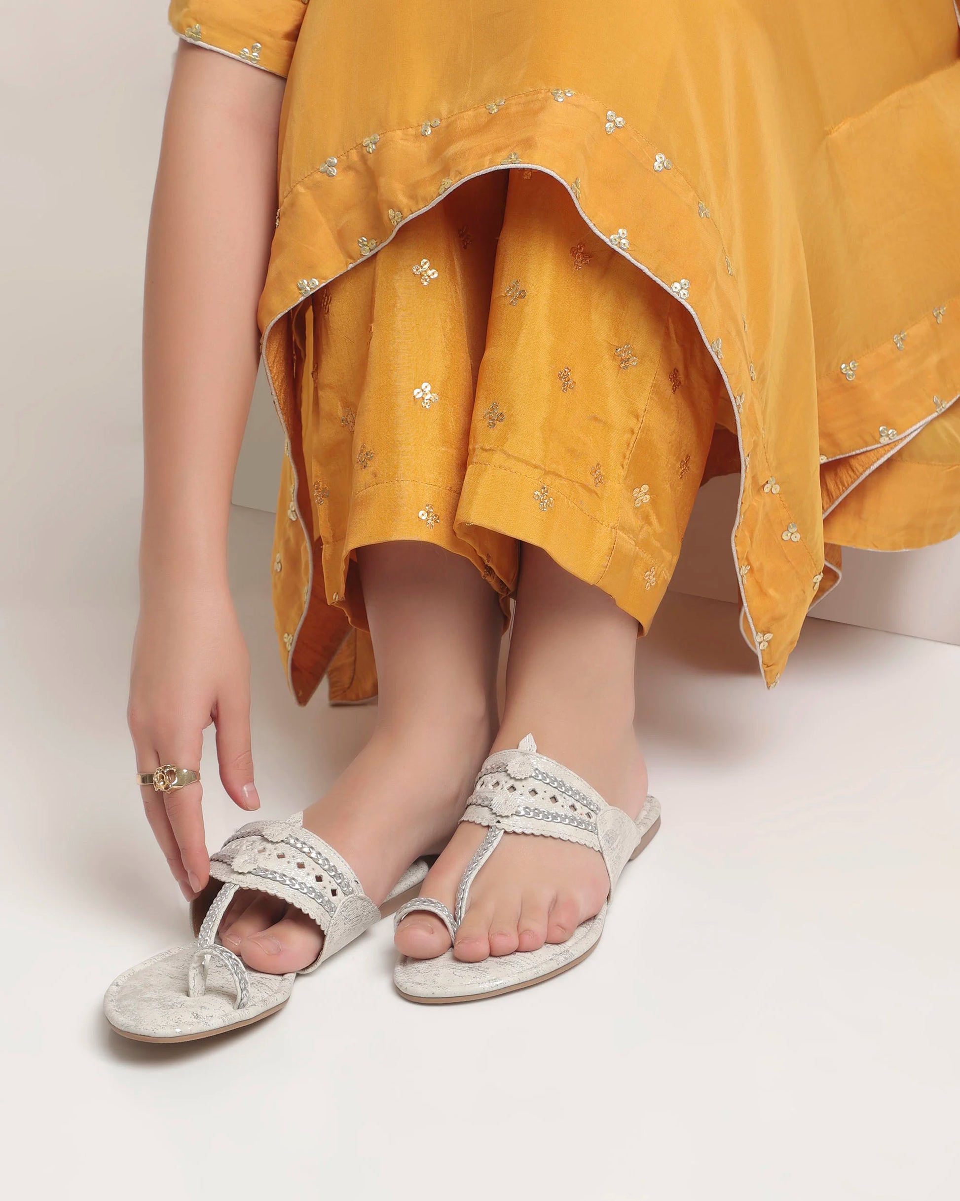 Pair these silver kolhapuri flats with an embroidered kurta set or a flowy ethnic skirt for festive occasions. For a chic fusion look, wear them with cropped trousers and a pastel blouse to add a touch of sparkle to your outfit.