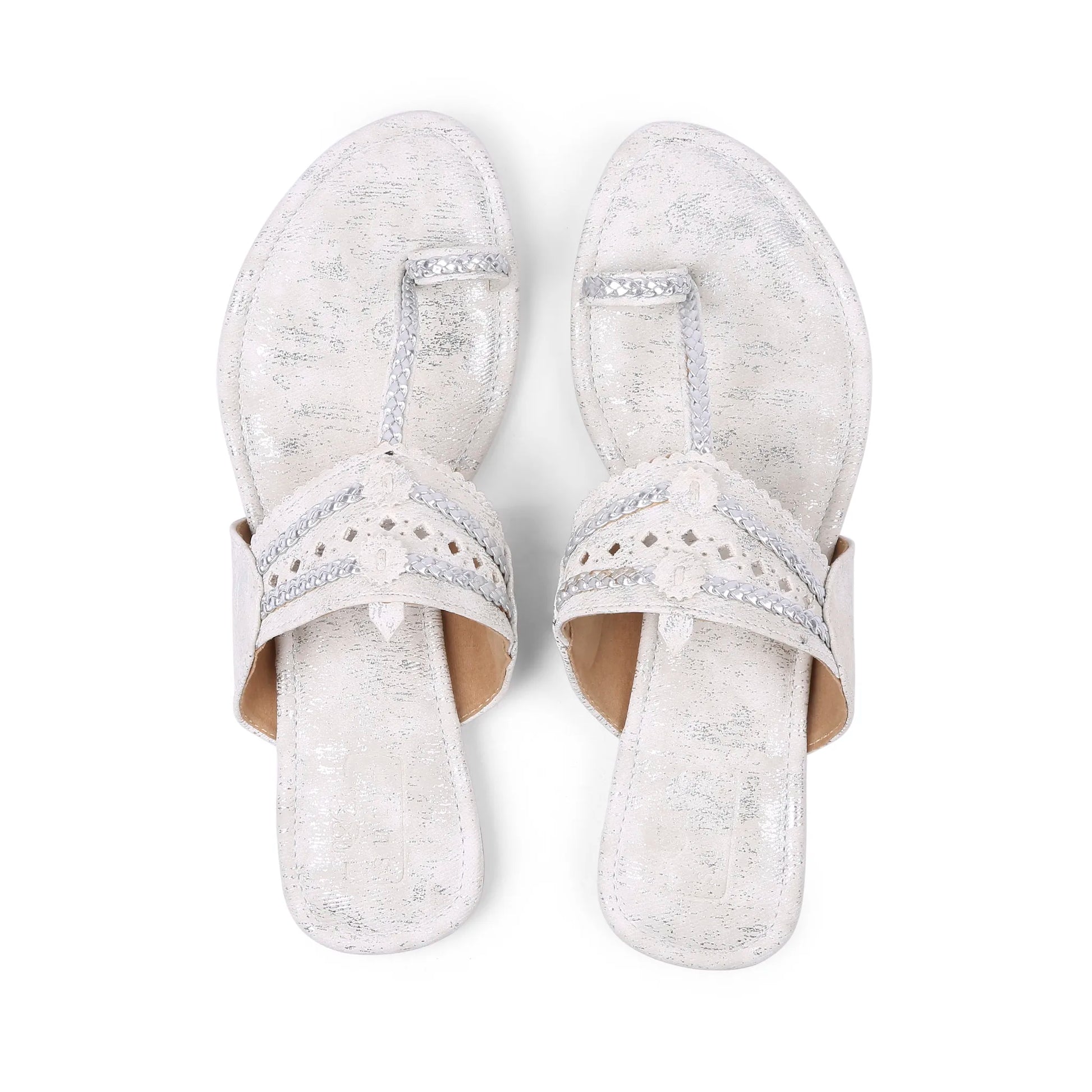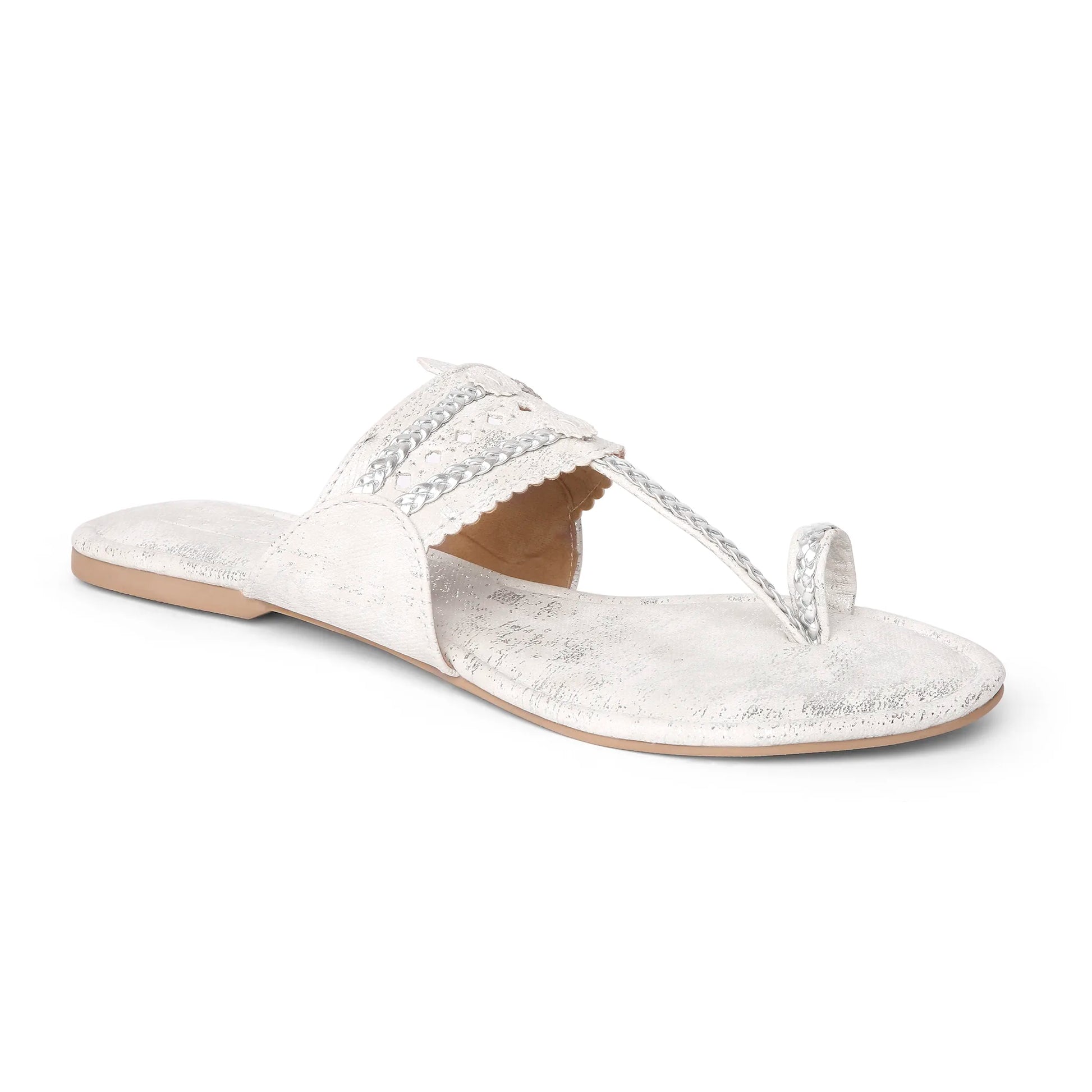 Step into elegance with these stunning silver ethnic kolhapuri flats. Crafted with a metallic shimmer finish, these sandals feature intricate cutwork detailing and a braided toe loop design for a blend of traditional charm and modern flair. The soft cushioned footbed ensures all-day comfort, while the slip-on style makes them perfect for effortless wear.