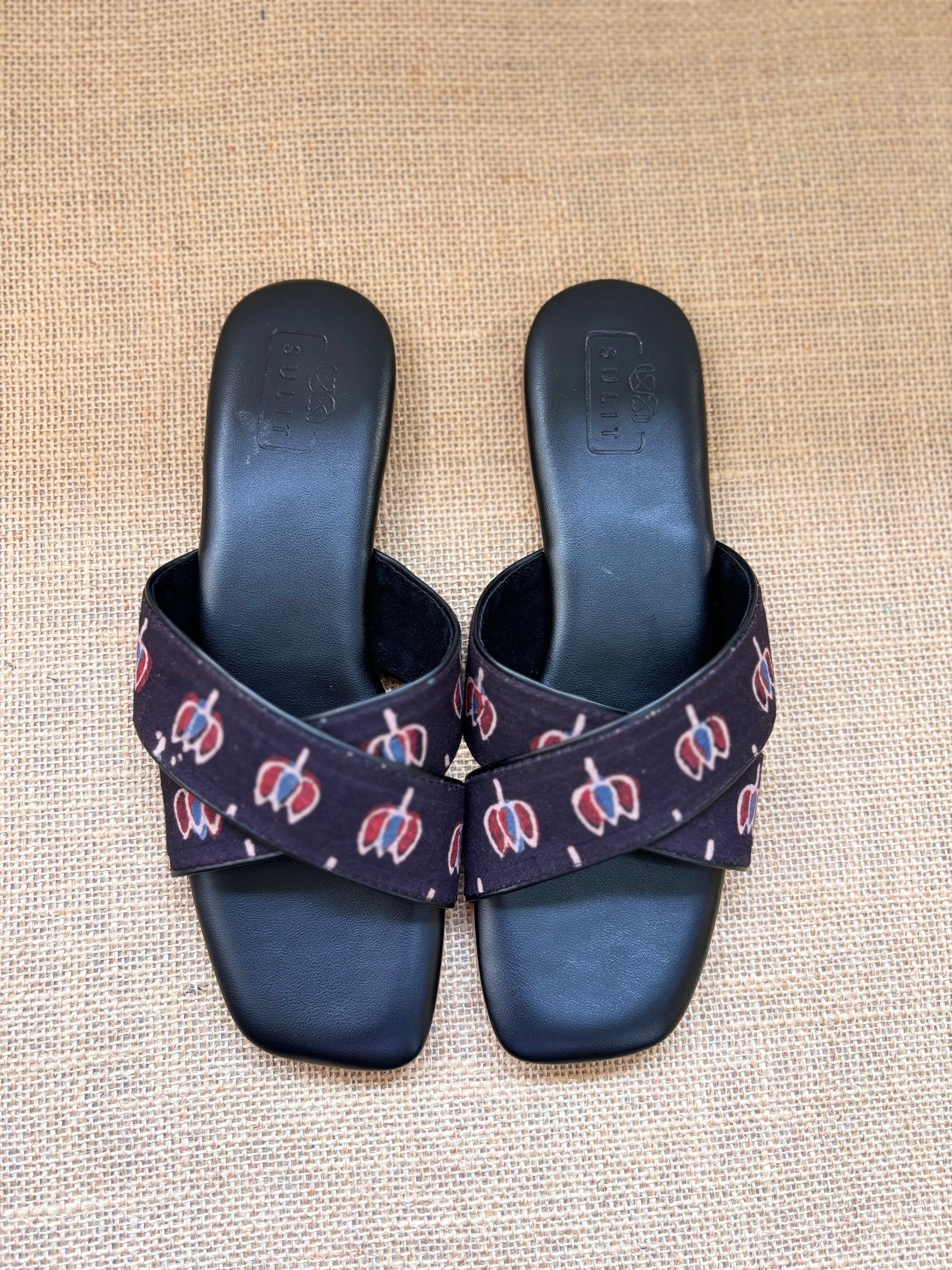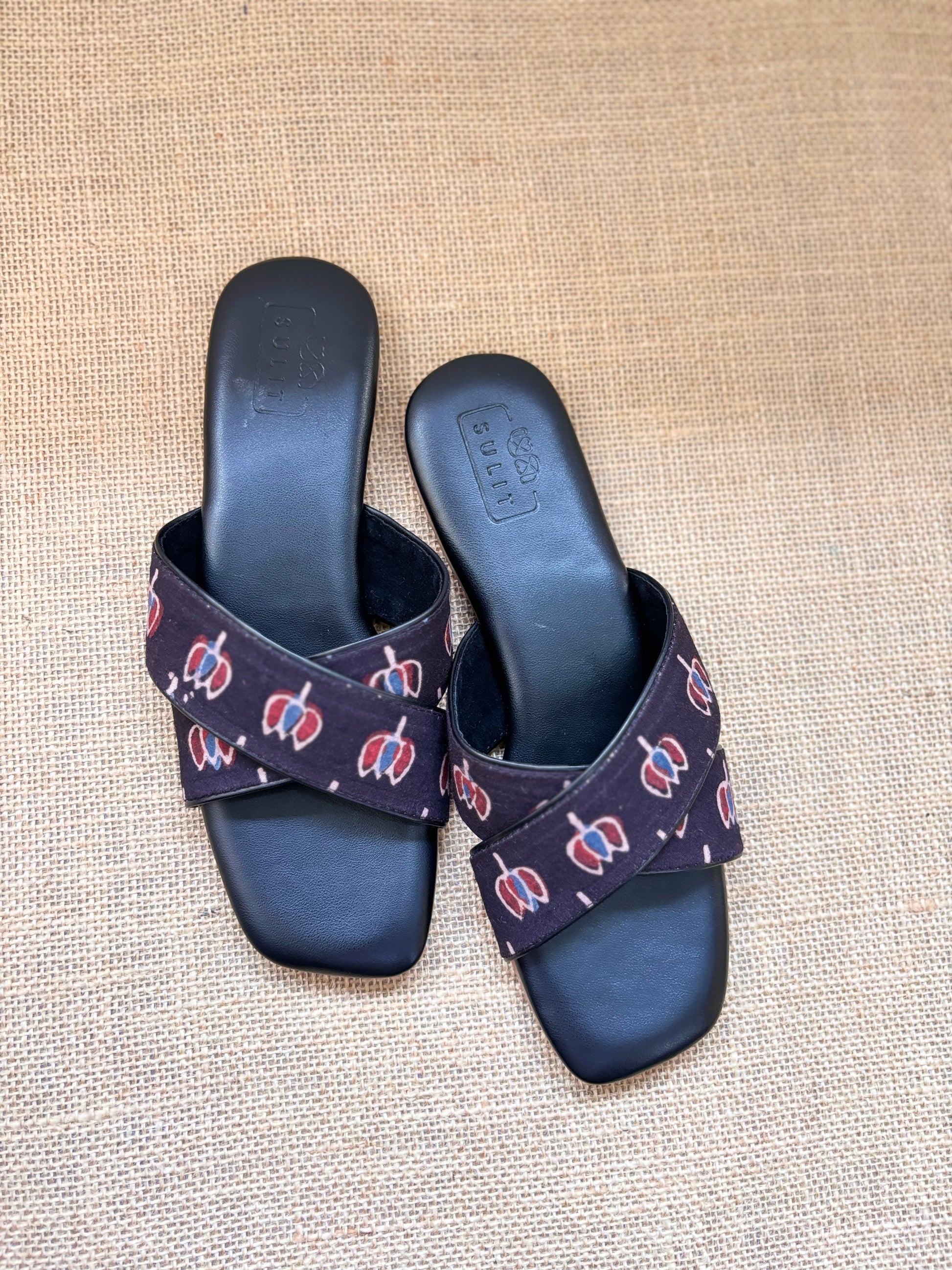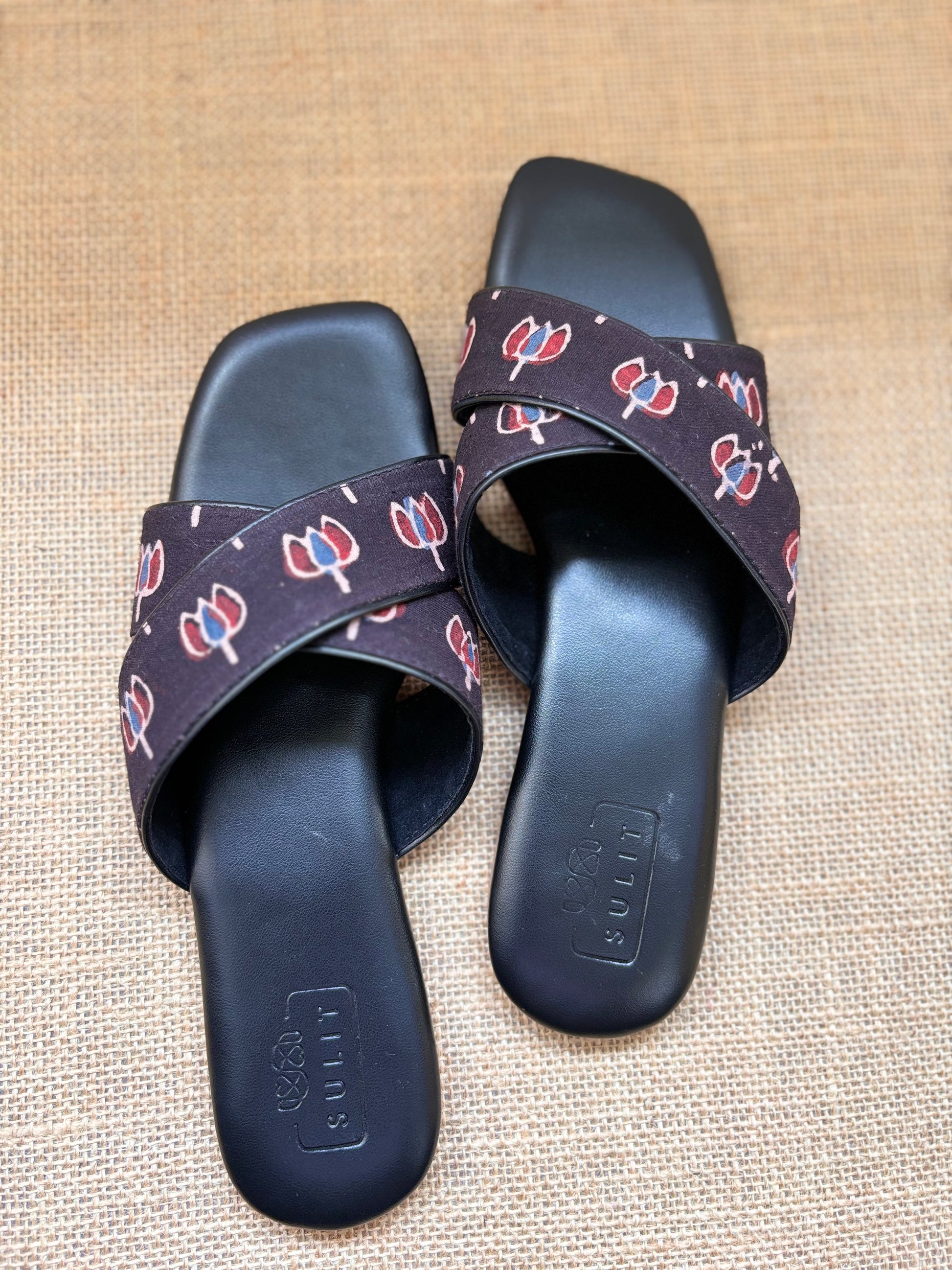 Elevate your everyday look with this ultra-comfortable pair featuring soft, cross-over straps in an eye-catching block print. The deep black sole adds contrast and structure, while the tulip-inspired motifs in red and blue give it a playful yet grounded appeal. Lightweight, durable, and easy to slip into, these flats are your go-to for casual outings and effortless style.