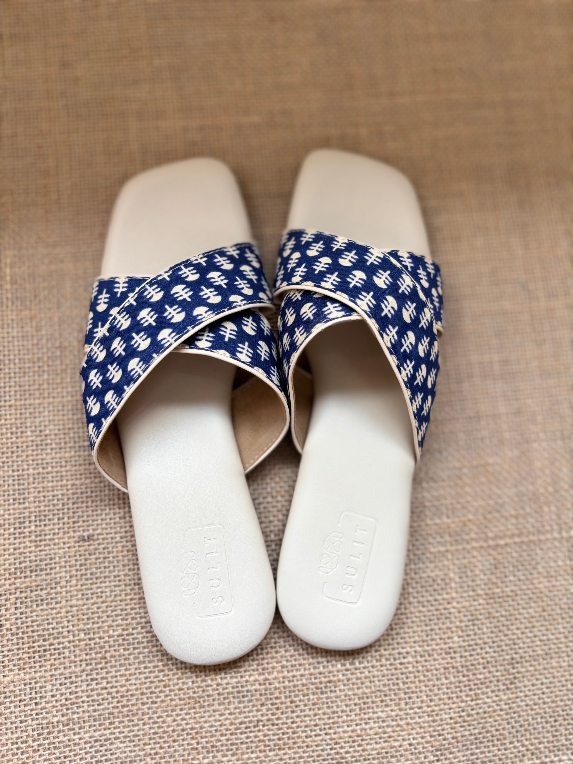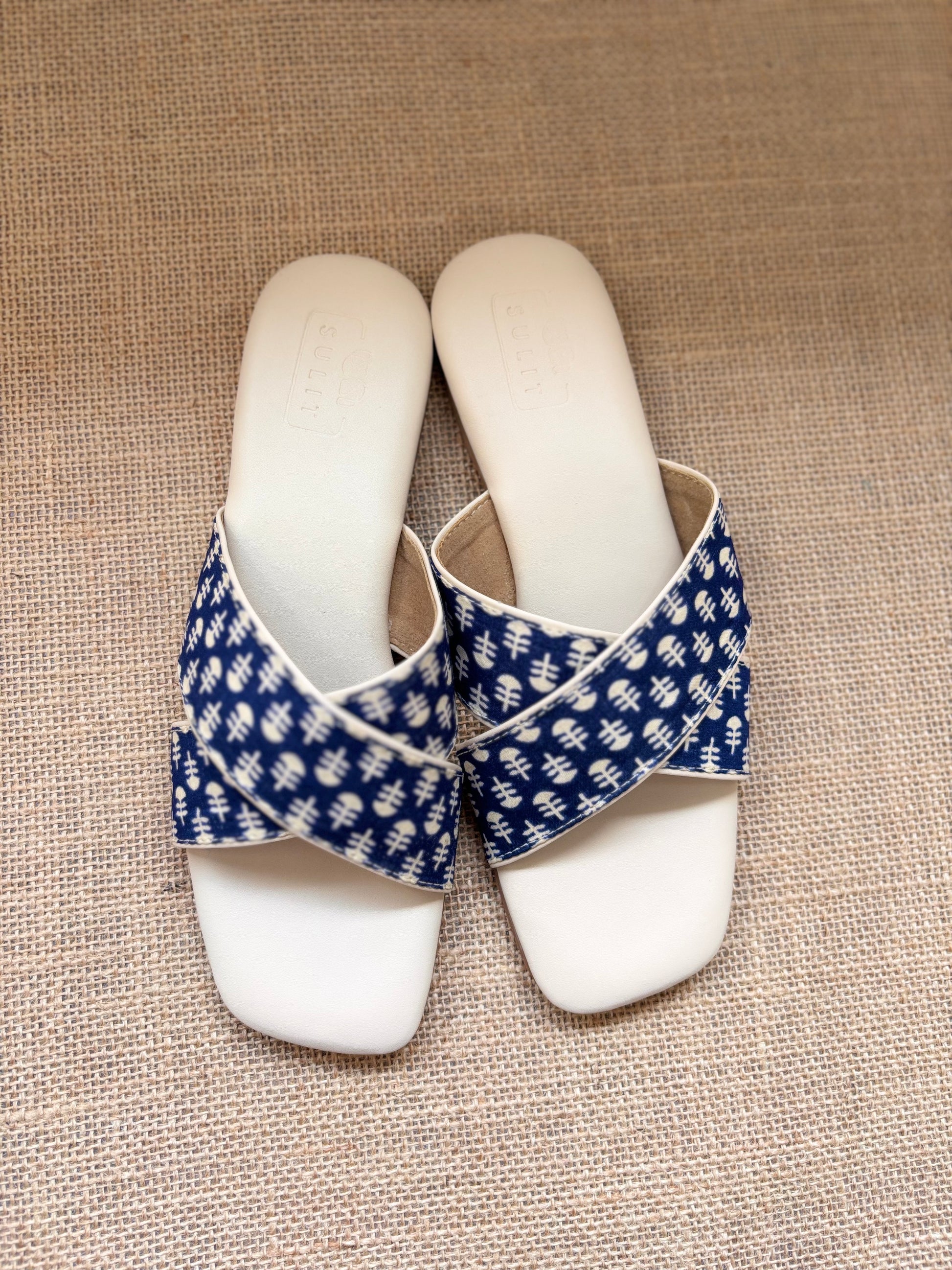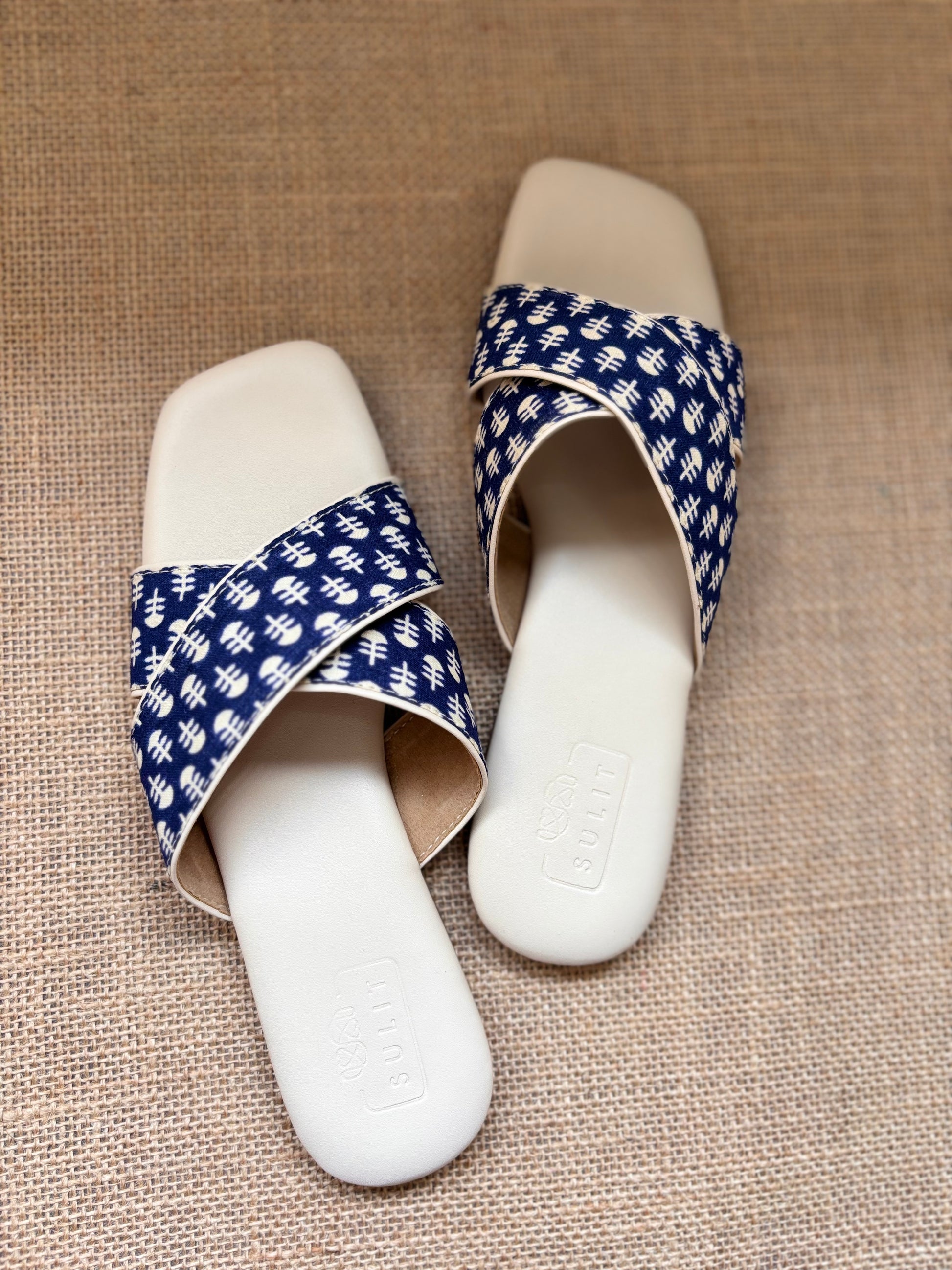 Bold, handcrafted, and beautifully rooted in Indian craft, this pair features a rich beige sole paired with cross-over fabric straps printed in a lively folk-inspired floral design. The soft footbed ensures comfort, while the contrast of dark indigo and warm beige adds a statement-making edge. Ideal for those who love blending culture with contemporary flair.