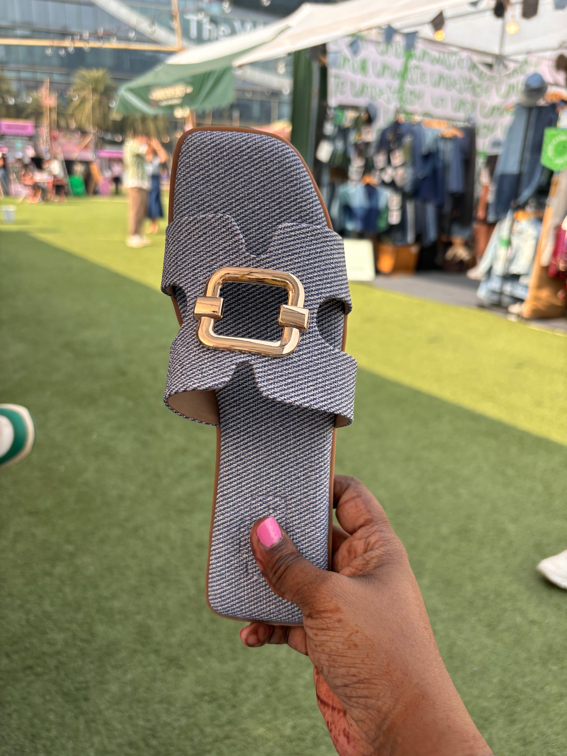 Step into effortless elegance with these chic open-toe slide sandals. Designed in a soft, textured light-blue material, they feature dual straps adorned with stylish gold-tone buckle accents for a refined, modern touch. The flat sole ensures all-day comfort, making them the perfect blend of fashion and ease. Ideal for pairing with both casual and elevated outfits, these sandals bring a fresh, sophisticated finish to any look.
