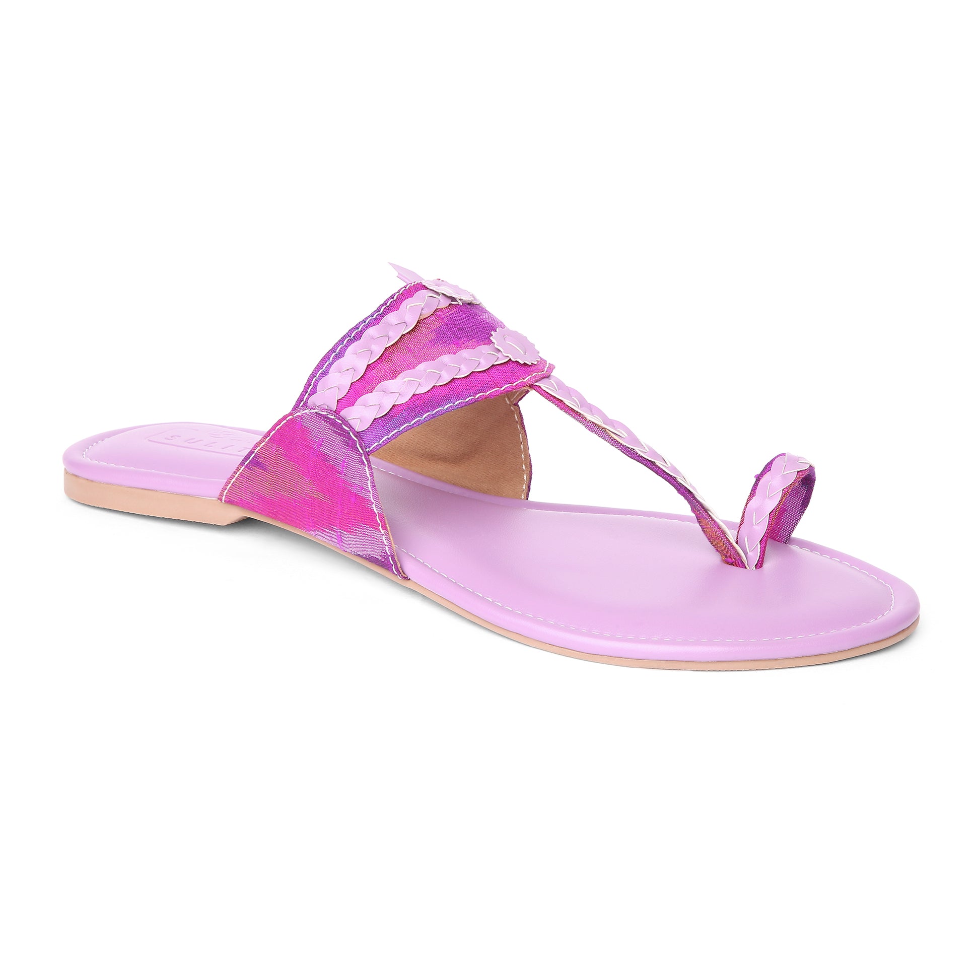 Step in effortless elegance with these handcrafted ethnic flat Kolhapuris. Designed with a classic toe-tinge silhouette,they feature a soft cushioned sole for all-day comfort and a beautifully detailed fabric accented with braided detailing. The minimal yet artisanal design makes them prefer for everyday wear while adding n a subtle statement to your look.