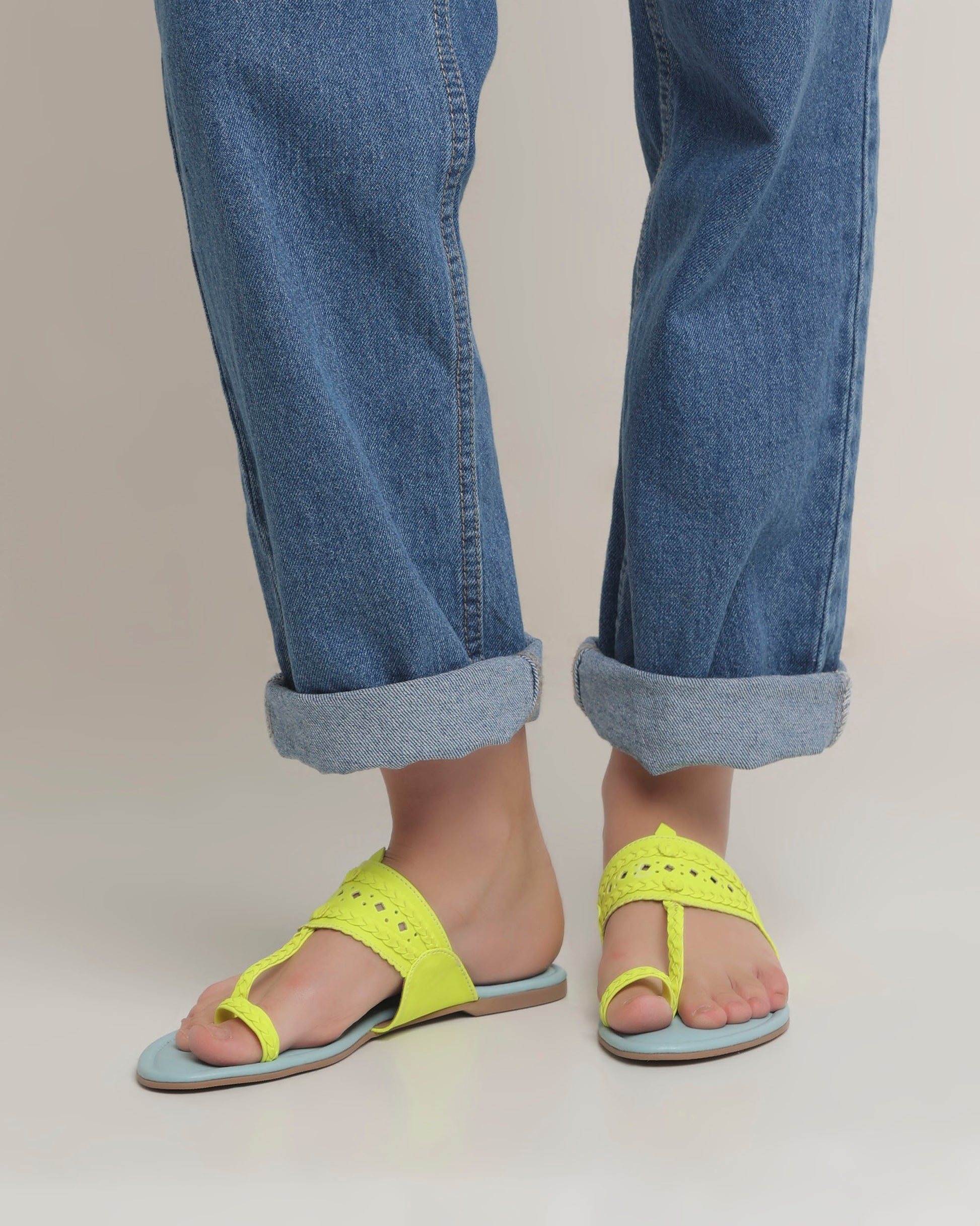 Electric-yellow straps pop against a powder-blue base, turning the timeless Kolhapuri into a bold statement piece. Flexible soles and hand-woven details complete the lively design.