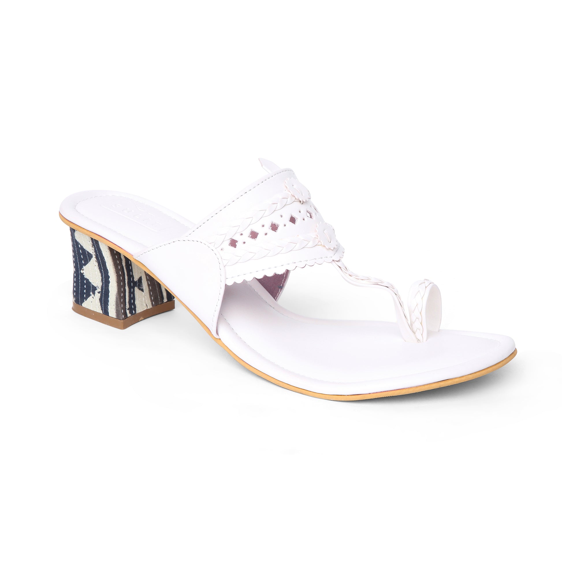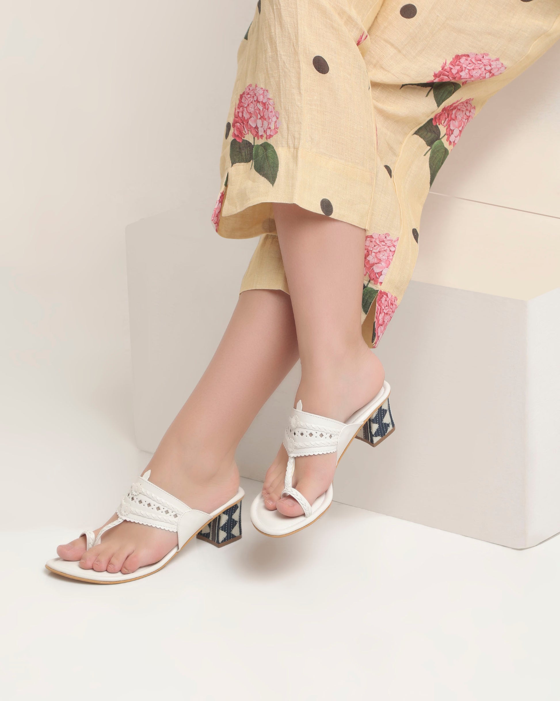 Elevate your everyday style with these elegant block heel sandals, thoughtfully crafted for comfort and timeless appeal. Featuring a refined toe-loop design and delicately detailed straps, this pair ensures a secure yet graceful fit. The sturdy block heel is wrapped in traditional Katha work fabric, adding a handcrafted artisanal accent that beautifully blends heritage craftsmanship with contemporary style.